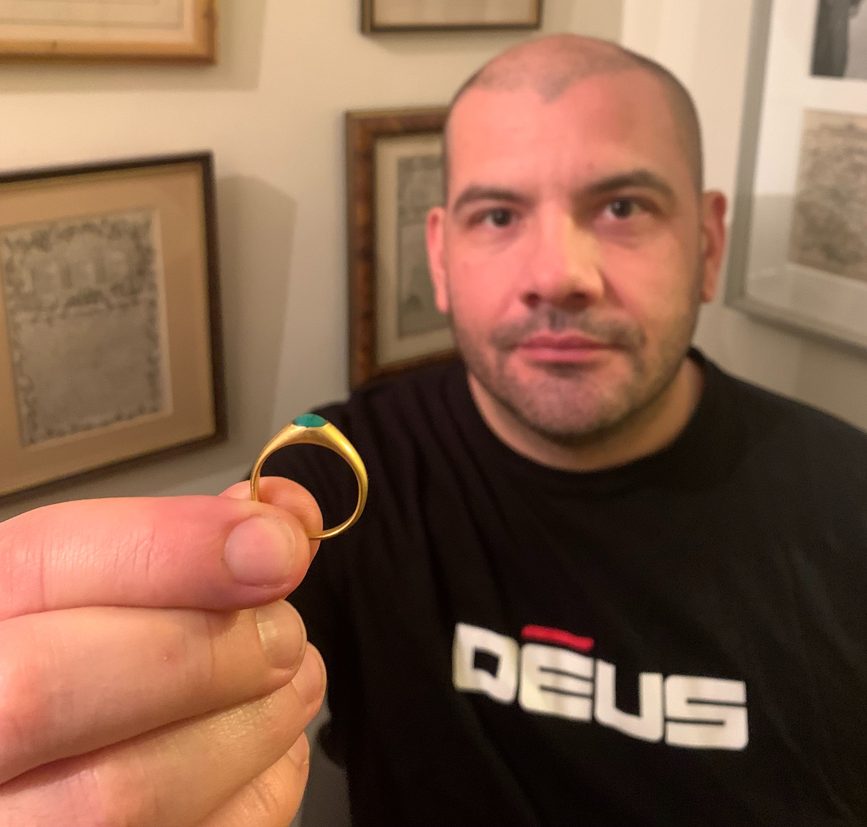 Vine, from Crewe and Nantwich Metal Detecting Society said, ‘I knew what it was by its colour,’ he says. ‘Rich buttery gold.’ The ring still held soil and fibrous micro-roots when it came out of the ground. He chose not to clean it fully himself, instead asking Steve King, who first introduced him to metal detecting, to uncover it properly. ‘It was a lovely thing to hold. It was my second gold item and far more than I ever expected to find.’